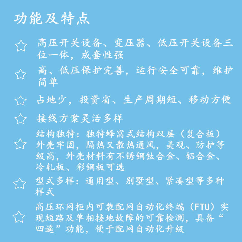 2.高壓側一般采用負荷開關,也可采用真空斷路器,并且有齊全的防誤操作功能。裝置可選用xgn15-12環(huán)網柜、hxgn2-12環(huán)網柜、xgn66-12金屬封閉開式開關柜等開關柜作為高壓側配電單元,低壓側可選用ggd.gck、mns、gcs等開關柜作為輸出單元,變壓器可選用油浸式變壓器或干式變壓器等。
