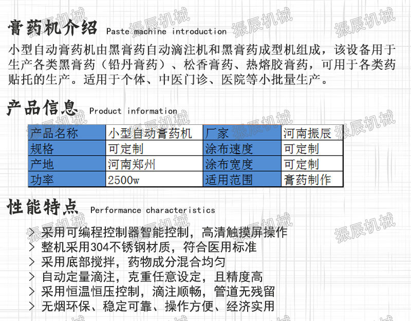 振辰機械傳承專業(yè)制作工藝,研發(fā)、制造中國專業(yè)的藥貼,是中醫(yī)藥貼生產(chǎn)的一次技術(shù)性改革。振辰藥貼設(shè)備現(xiàn)已涵蓋:小型滴注成型、自動化滴注成型一體機、藥貼基質(zhì)涂布機、自動貼片機、自動包裝機、以及非標(biāo)藥貼設(shè)備等二十多個產(chǎn)品類型,規(guī)劃為滴注系列、涂布系列、貼片系列、非標(biāo)藥貼四大系列產(chǎn)品?梢陨a(chǎn)加工創(chuàng)可貼、膏藥貼、打孔貼、退熱貼、電極貼、肚臍貼、排毒貼、發(fā)熱貼等產(chǎn)品。...