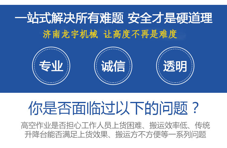 濟(jì)南龍宇升降機(jī)械有限公司,成立于2000年5月,組織精英工程師專注研發(fā)液壓升降平臺(tái)、升降機(jī)、液壓貨梯、液壓登車橋,現(xiàn)屬中國(guó)起重運(yùn)輸倉(cāng)儲(chǔ)物流協(xié)會(huì)會(huì)員,省級(jí)重合同守信用單位。