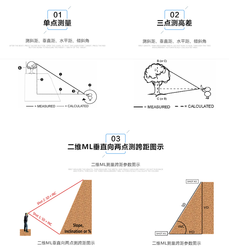 測(cè)量模式: 水平距離、垂直距離、斜距和傾斜角(或百分比斜率)