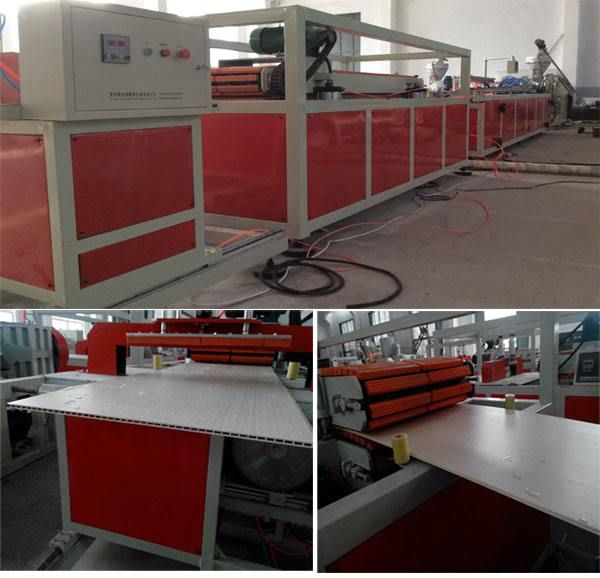 pvc墻板生產(chǎn)線主要由錐型雙螺桿擠出機(jī)、真空定型臺、牽引機(jī)、切割機(jī)、接料架組成。生產(chǎn)線采用智能控制,自動化程度高、設(shè)備穩(wěn)定、操作簡便、生產(chǎn)效率高。通過更換不同規(guī)格的模具可以生產(chǎn)多種規(guī)格、尺寸、形狀、厚度的木塑裝飾墻板。