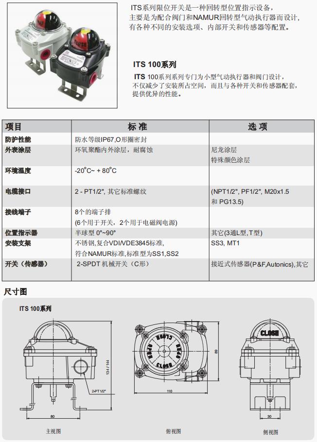 its系列限位開(kāi)關(guān) 是一種回轉(zhuǎn)型位置指示設(shè)備,主要是為配合閥門(mén)和namur會(huì)轉(zhuǎn)型氣動(dòng)執(zhí)行器而設(shè)計(jì),有各種不同的安 裝選擇、內(nèi)部開(kāi)關(guān)合傳感器等配置。