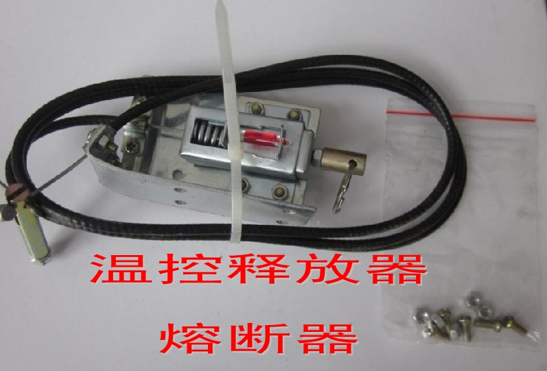卷簾門(mén)溫控熔斷釋放裝置,適用于垂直地面卷放的防火卷簾門(mén),在其箱體內(nèi)裝有可移動(dòng)的滑塊,一拉簧分別與滑塊及箱體連接,一拉繩分別與滑塊及卷簾門(mén)開(kāi)閉機(jī)之離合器連接,二銷軸分別穿過(guò)滑塊和箱體,銷軸兩端裝有易熔合金焊接的金屬片,當(dāng)環(huán)境溫度超過(guò)某定值。易熔合金熔化, 金屬片分離, 在彈簧,力作用下拉繩牽動(dòng)離合器脫離,卷簾門(mén)自動(dòng)釋放下降。