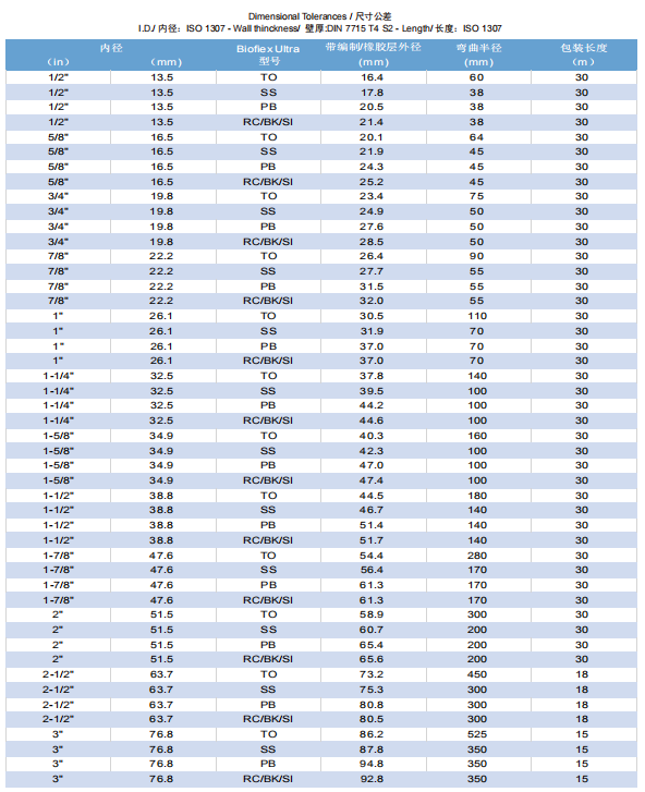 bioflex ultra特氟龍軟管型號一般用2個字母來表述,詳細介紹如下示例:“bioflex ultra as,pb,sg”定義的軟管為:防靜電ptfe內襯(as)pb編織(pb)并帶有一個hdpe