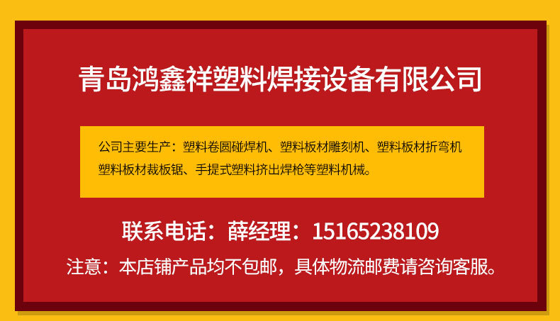 青島鴻鑫祥塑料焊接設備有限公司所從事折彎機、大型雕刻機、PP板PE板塑料焊條生產(chǎn)線、擠出式塑料焊機(手提式塑料焊機)的設計和生產(chǎn)的專業(yè)廠家,產(chǎn)品廣泛應用于塑料焊接、塑料化工防腐、塑料容器焊接、塑料管材及塑料管件焊接制作及電鍍設備制作等各行各業(yè)。今年又開發(fā)生產(chǎn)了自動塑料板材折彎機、塑料碰焊機、塑料下料機等等。為電鍍設備行業(yè)、環(huán)保設備行業(yè),彌補了塑料產(chǎn)業(yè)加工,提供了質(zhì)美價廉的設備,彌補了塑料行業(yè)的不足...