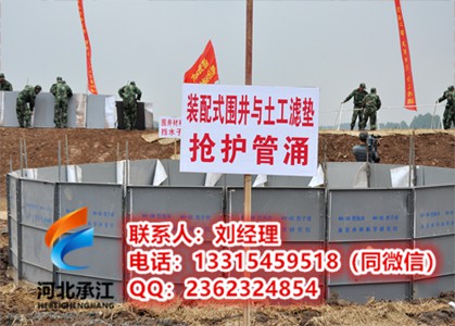 防汛裝配式圍井圍板是搶護堤防管涌的有效措施之一。其作用原理是使圍井內(nèi)保持一定的水位,降低管涌孔口處的水力坡降,減少動水壓力,使管涌流動的土顆;謴(fù)穩(wěn)定,從而達到抑制管涌破壞繼續(xù)發(fā)展,它既可用于搶護單個管涌,又可搶護管涌群。一種全新、快捷、廉價、環(huán)保型防汛搶險器材,具有施工高效,搶險強度低,裝配靈活,適應(yīng)性強,便于運輸,可重復(fù)使用等特點。