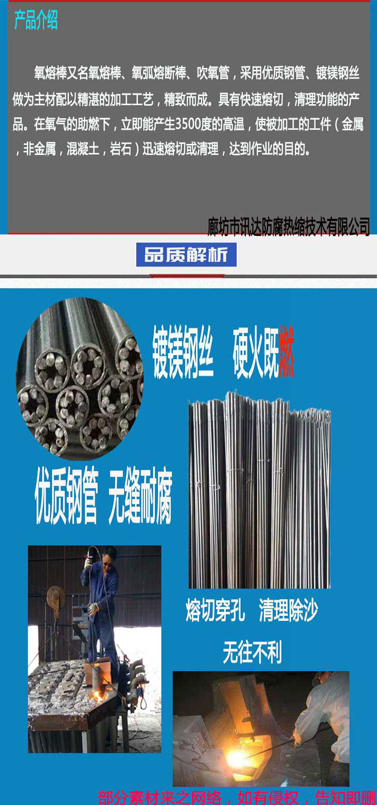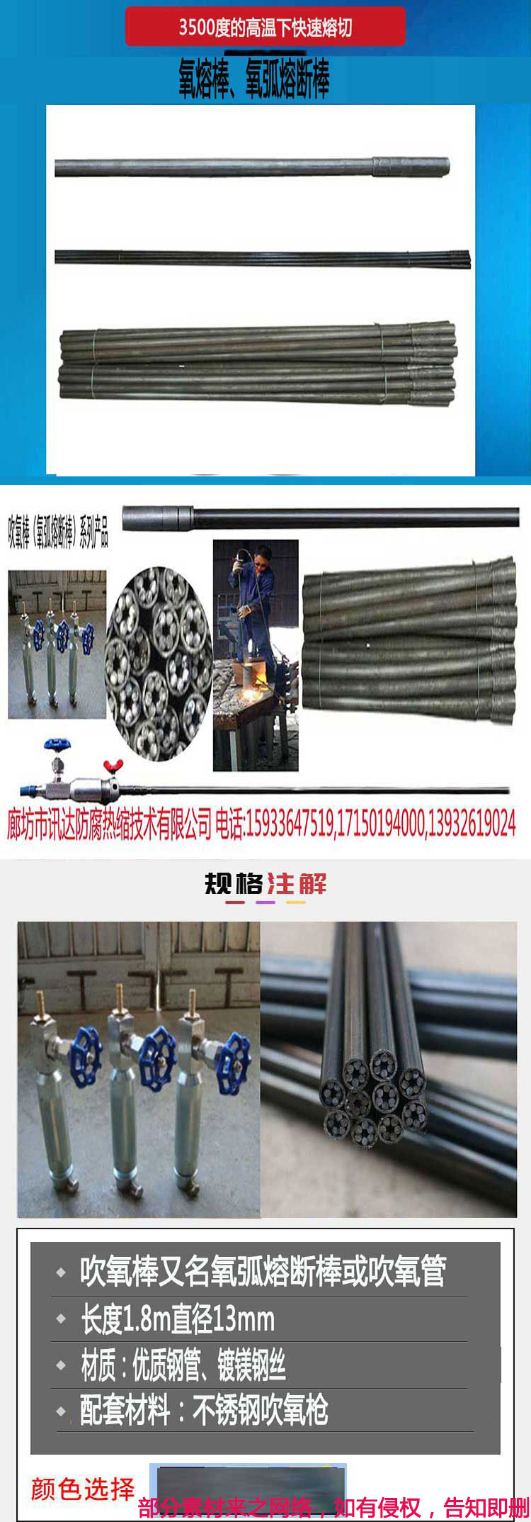 氧熔棒又名氧熔棒、氧弧熔斷棒、吹氧管,采用無(wú)縫鋼管、鍍鎂鋼絲做為主材配以精湛的加工工藝,精致而成。具有快速熔切,清理功能的產(chǎn)品。在氧氣的助燃下,立即能產(chǎn)生3500度的高溫,使被加工的工件(金屬,非金屬,混凝土,巖石)迅速熔切或清理,達(dá)到作業(yè)的目的.