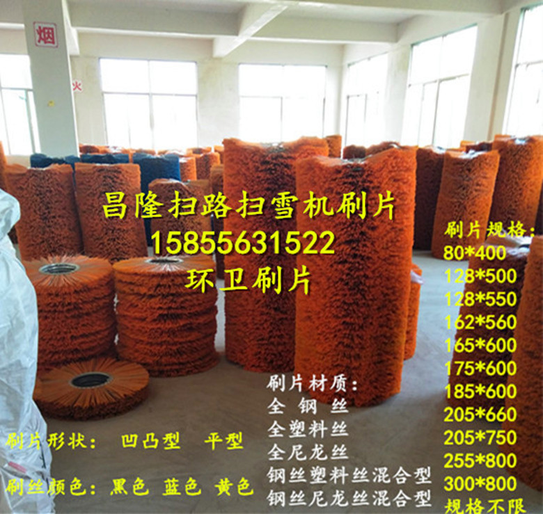 掃路刷掃雪刷護(hù)欄刷環(huán)衛(wèi)刷生產(chǎn)廠家-安 徽精泰環(huán)衛(wèi)刷有限公司生產(chǎn)的掃路車掃雪車毛刷片,是生產(chǎn)各類掃路掃雪刷片及刷輥的毛刷廠家!掃雪刷輥價(jià)格實(shí)惠!掃雪刷輥質(zhì)量!產(chǎn)品適用于德國(guó)施密特、威海廣泰、武漢九通、沈陽德通、美國(guó)mb掃雪車、山東匯強(qiáng)等廠家生產(chǎn)掃雪車的掃雪滾刷更換,可為各大掃雪車廠家的配套,產(chǎn)品銷往北京、哈爾濱、沈陽、長(zhǎng)春、新疆等地,也為空軍各大機(jī)場(chǎng)服務(wù)。精泰掃路掃雪刷片采用進(jìn)口尼龍刷絲、鍍鋅鋼絲和pp絲等材質(zhì),強(qiáng)度高、抗磨損、耐腐蝕、特別是能在超低溫氣候下工作。主要用于國(guó)內(nèi)外各種掃雪車,裝載車,滾刷片常用規(guī)格有:內(nèi)徑128,外徑500,內(nèi)徑162,外徑550,內(nèi)徑165,外徑600,內(nèi)徑205,外徑660,內(nèi)徑208,外徑670,內(nèi)徑255,外徑800,內(nèi)徑300,外徑900,內(nèi)徑500,外徑1500等規(guī)格,可按客戶要求,刷絲有pp絲和pp絲和鋼絲混合。掃雪刷片采用pp絲+彈簧鋼絲組合材質(zhì)設(shè)計(jì)的滾刷,不掉毛、不斷毛、耐磨、不損傷路面且掃雪效果好,精泰掃雪刷片能在超低溫氣候條件下長(zhǎng)時(shí)間掃雪不折斷,彈性好。精泰掃路刷片掃雪刷片質(zhì)量已得到廣大客戶的認(rèn)可了,具有耐磨抗高溫等特點(diǎn),產(chǎn)品質(zhì)量實(shí)行三包,價(jià)格從優(yōu),歡迎新老來人來電洽談?dòng)嗁?gòu)!