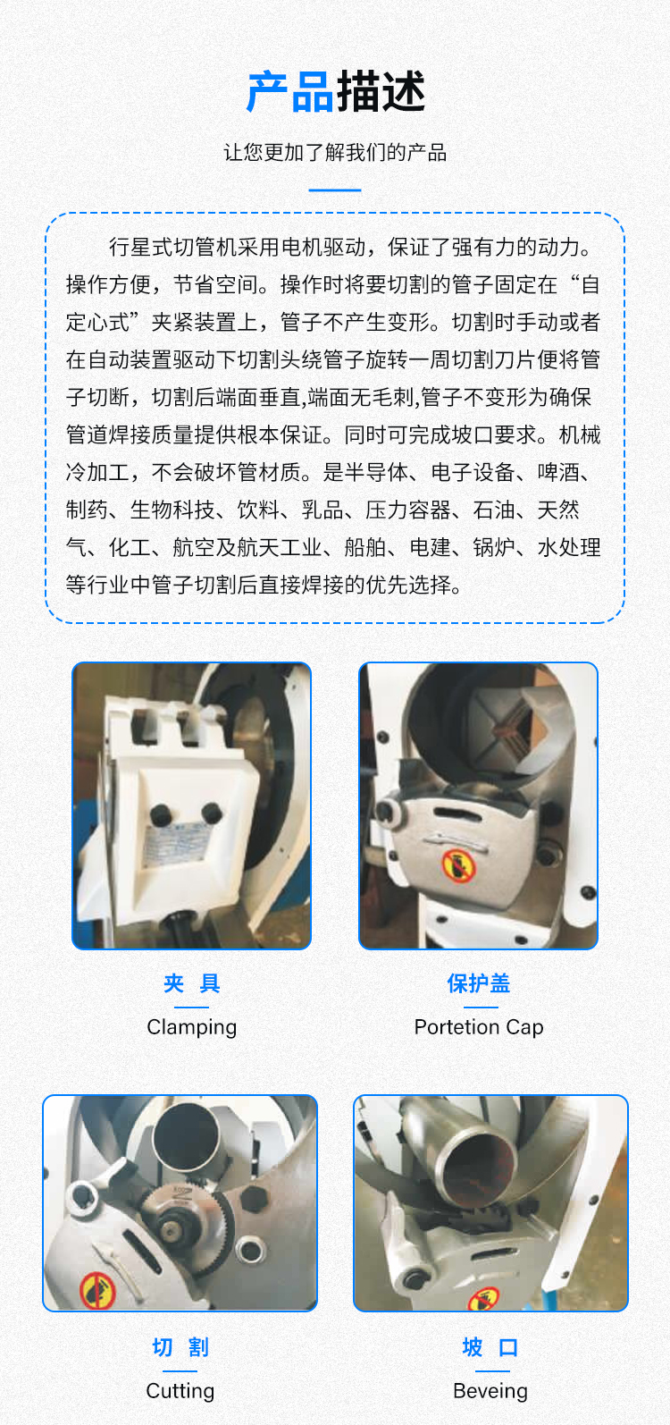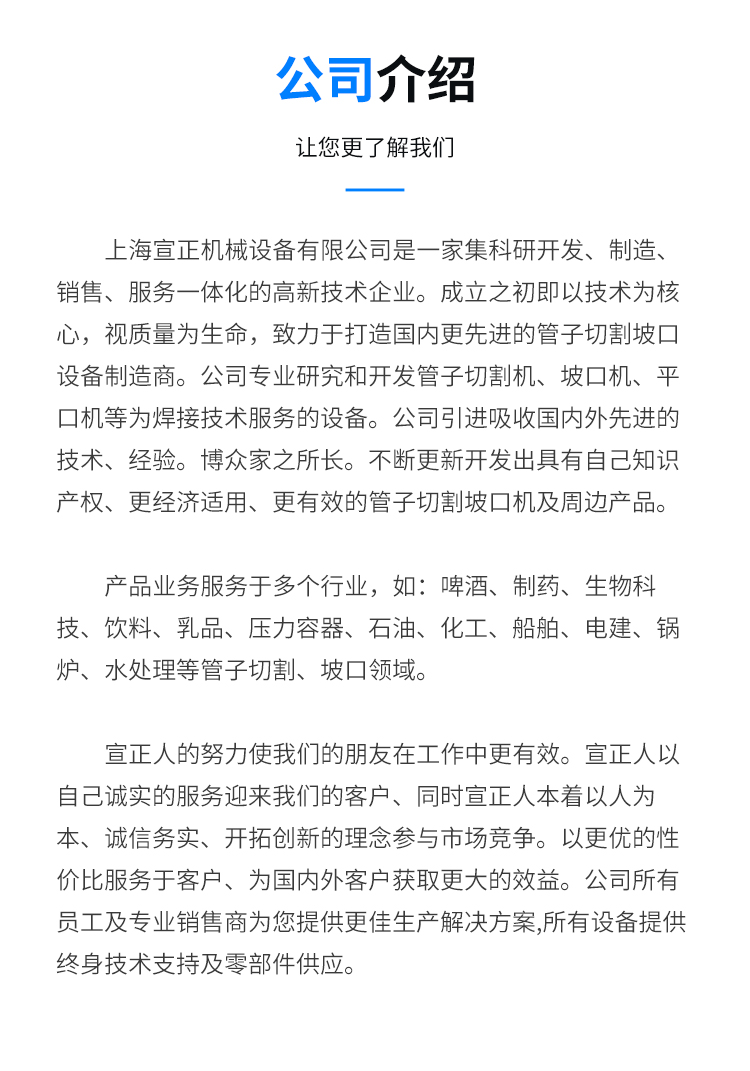 上海宣正機(jī)械設(shè)備有限公司是一家集科研開發(fā)、制造、銷售、服務(wù)一體化的高新技術(shù)企業(yè)。成立之初即以技術(shù)為核心,視質(zhì)量為生命,致力于打造國(guó)內(nèi)一流的管子切割坡口設(shè)備制造商。公司專業(yè)研究和開發(fā)管子切割機(jī)、坡口機(jī)、平口機(jī)等為焊接技術(shù)服務(wù)的設(shè)備。公司引進(jìn)吸收國(guó)內(nèi)外先進(jìn)的技術(shù)、經(jīng)驗(yàn)。博眾家之所長(zhǎng)。不斷更新開發(fā)出具有自己知識(shí)產(chǎn)權(quán)、更經(jīng)濟(jì)適用、更高效的管子切割坡口機(jī)及周邊產(chǎn)品。