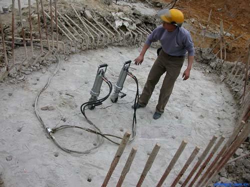 對于厚度大于10cm的素 混凝土橋面,先采用風(fēng)機鉆孔(注意孔深與砼厚度一致),鉆孔間距為30cm*40~50cm(排距*列距);然后用液壓混凝土分裂機破碎成30cm*40~50cm的大塊;后人工、撬棍搬移。同時注意清渣時一定要清理干凈,接近防撞墻時要槽向劈裂,孔的排拒和列距縮小到20cm。