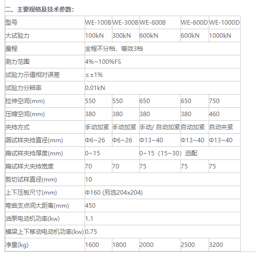 一、功能用途: we系列液晶數(shù)顯式萬能試驗機(jī)用于各種金屬材料的拉伸、壓縮、彎曲及剪切試驗,亦可用作塑料、混凝土、水泥等非金屬材料的壓縮試驗,增加簡單附件,可完成膠帶鏈條,鋼絲繩、電焊條、瓦及構(gòu)件的多種性能試驗。本機(jī)采用油缸下置式、高度低、重量輕、尤其適用于工程施工部門。