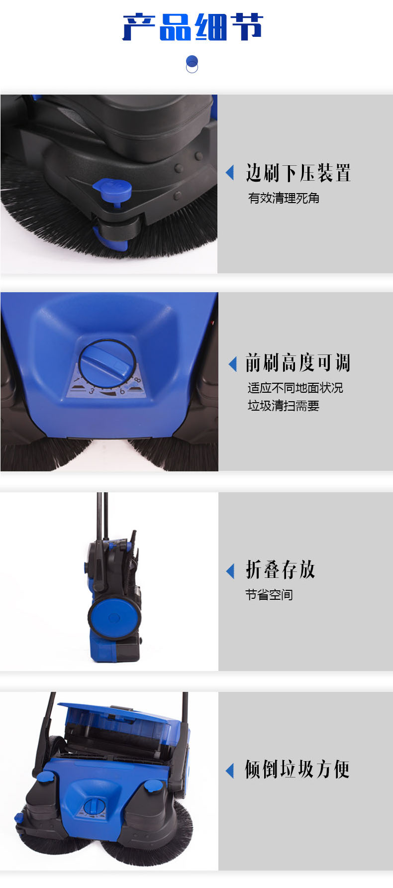 3.邊刷擁有清掃能力,清掃省時省力,可收隊調(diào)節(jié)高低,能適應(yīng)多種情況