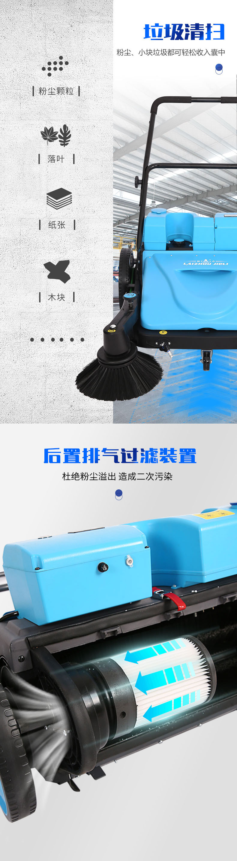 jl950系列擁有加高的底盤。能清掃粉 塵、小顆粒垃圾。也能同時清掃體積較大的塊狀垃圾。能做到各種垃圾兼顧:干、濕、粉 塵、塊狀垃圾,可一次性清理干凈。