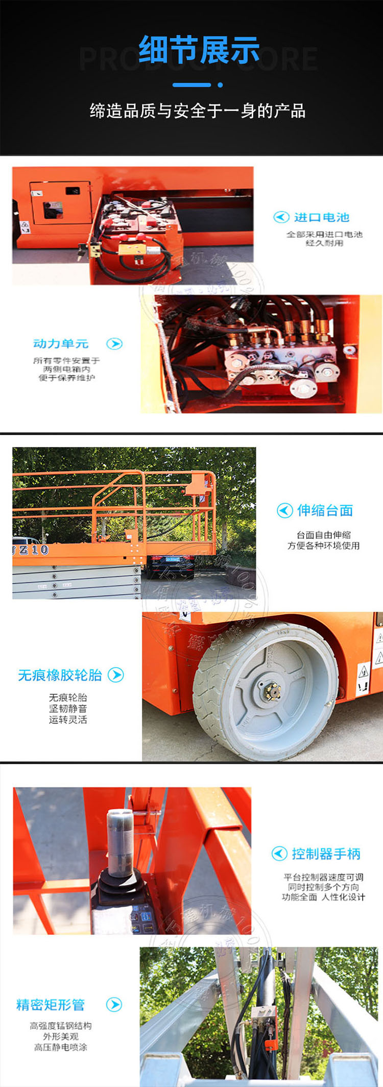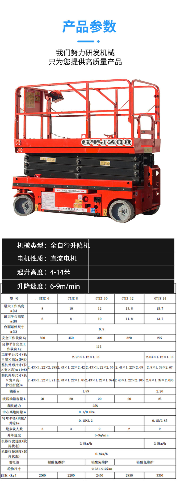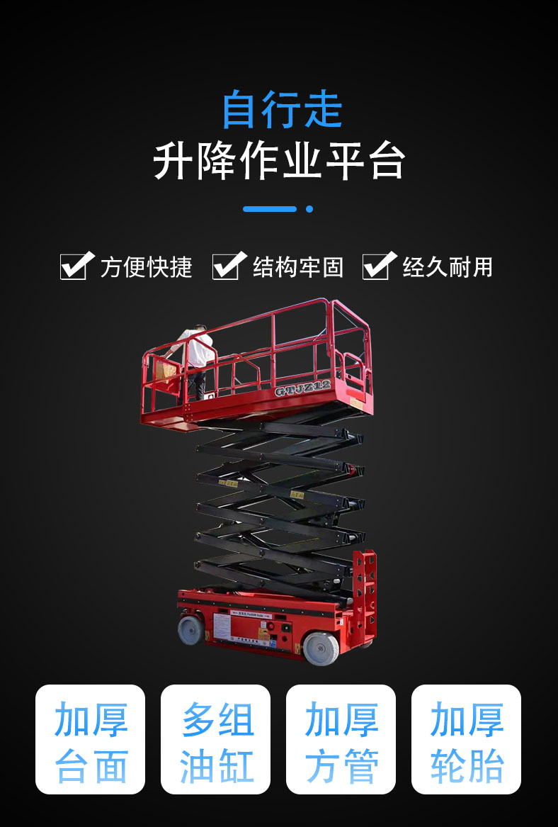 全自行平臺結(jié)構(gòu)堅固,使升降平臺的偏轉(zhuǎn)與擺動極小。具有自動行走功能,采用電瓶控制行走,能夠在不同工作狀態(tài)下,不需外接電源,手柄控制行走, 行走速度可調(diào),移動靈活、操作方便、升降自如,只需一人便可完成前進、后退、轉(zhuǎn)向、快、慢速行走和上下等動作,省工、省力?筛鶕(jù)用戶使用要求設(shè)計生產(chǎn)。