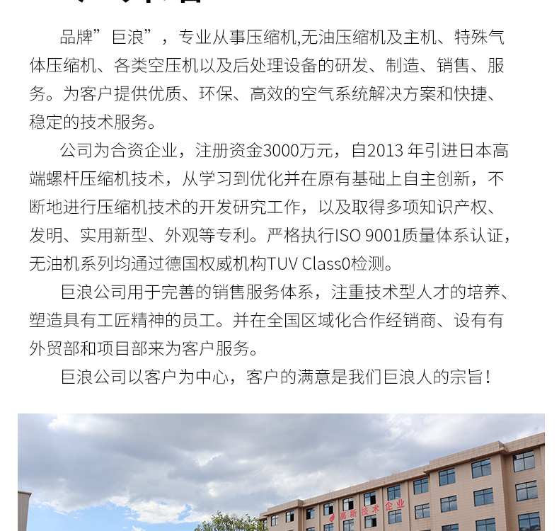 品牌巨浪專業(yè)研發(fā)與制造壓縮機、無油壓縮機及主機、特殊氣體壓縮機、各類空壓機以及后處理設(shè)備。我們始終致力于為客戶提供高效、環(huán)保的空氣系統(tǒng)解決方案,以及穩(wěn)定、快捷的技術(shù)服務(wù)。