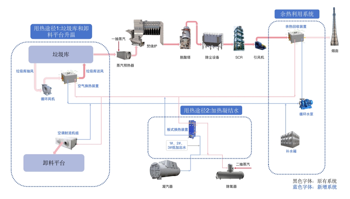余熱利用途徑描述:根據(jù)垃圾焚燒電廠的用熱需求,可將回收的余熱用于加熱凝結(jié)水,提高除氧器進(jìn)水溫度,降低除氧器對(duì)蒸汽的消耗,可為企業(yè)節(jié)省大量的蒸汽,也可用于加熱焚燒爐一次風(fēng),提高焚燒爐的進(jìn)風(fēng)溫度,減少新蒸汽的消耗,節(jié)約的蒸汽可用于發(fā)電或供熱,提高企業(yè)的經(jīng)濟(jì)效益。另外,采暖季時(shí),回收的余熱通過空氣換熱裝置可為垃圾庫升溫使用,提高垃圾庫環(huán)境溫度,減少垃圾發(fā)酵時(shí)間,提高垃圾處理效率。同時(shí),回收的余熱可以通過射流機(jī)組供卸料平臺(tái)采暖使用或用于加熱鍋爐補(bǔ)水、供熱、洗浴、制冷等。