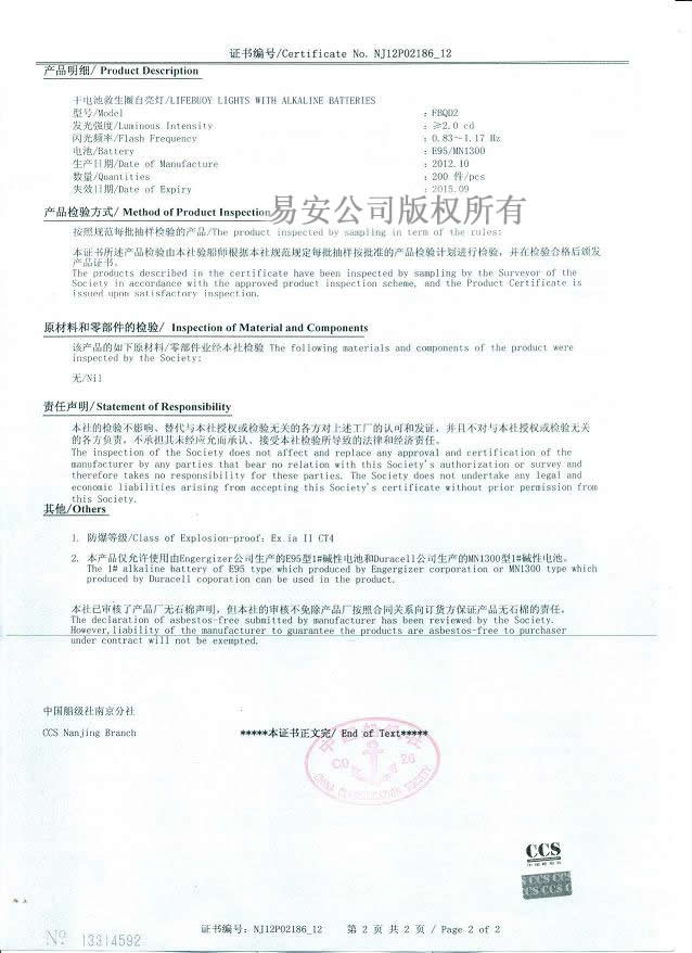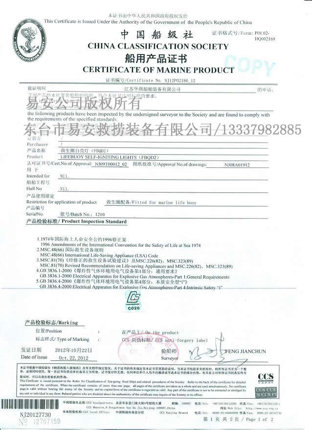 本系列產(chǎn)品符合:1974年solas公約1996年修正案和國際救生設(shè)備規(guī)則及海安會決議msc.81(70) 救生設(shè)備試驗(yàn)的要求。