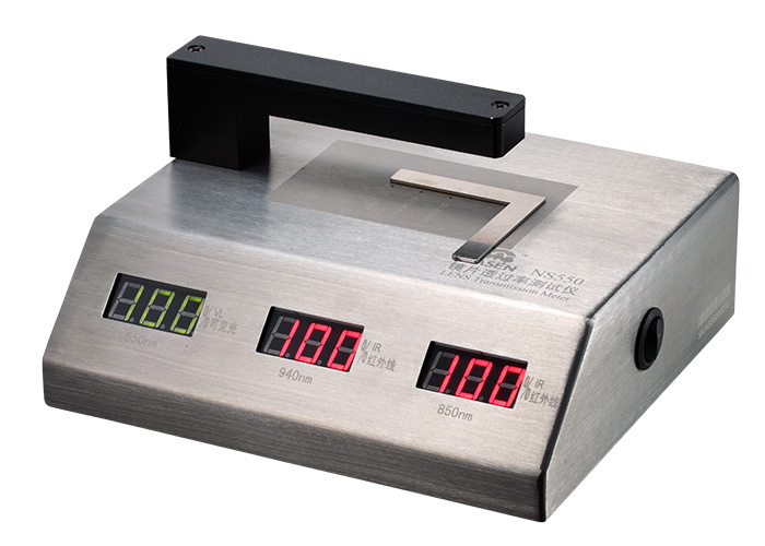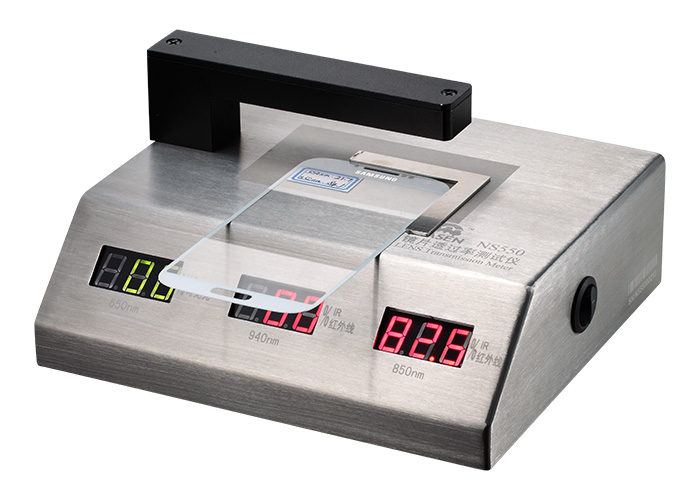 ns550鏡片透過率測量儀的測試原理是采用紅外850nm光源,紅外940nm光源和可見550nm光源照射被測透明物質(zhì),感應(yīng)器分別探測三種光源的入射光強(qiáng)和透過被測透明物質(zhì)后的光強(qiáng),透過光強(qiáng)與入射光強(qiáng)的比值即為透過率,用百分?jǐn)?shù)表示。