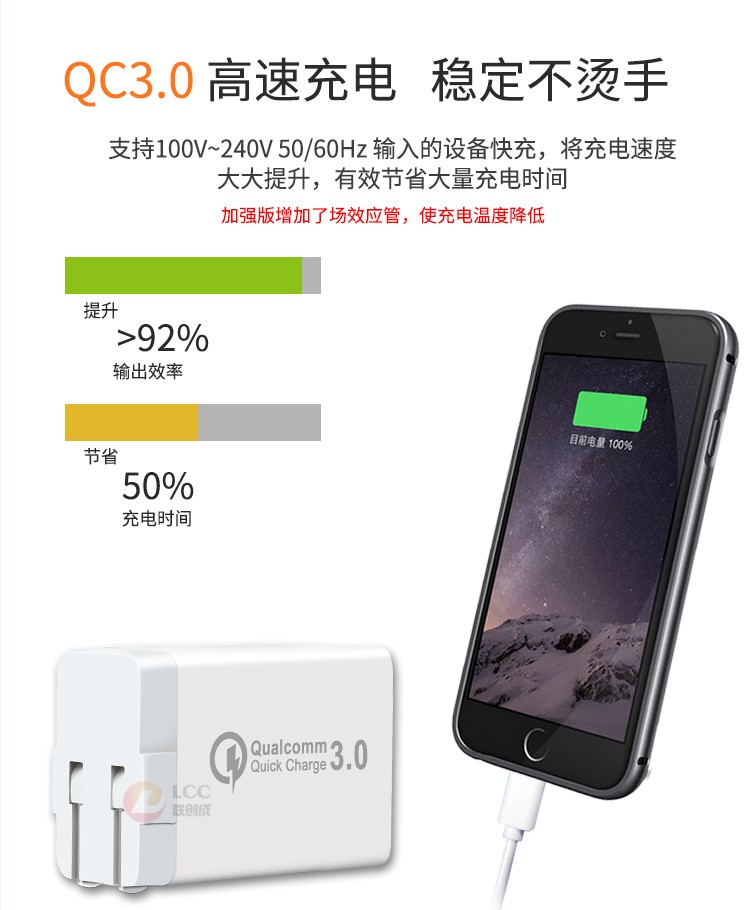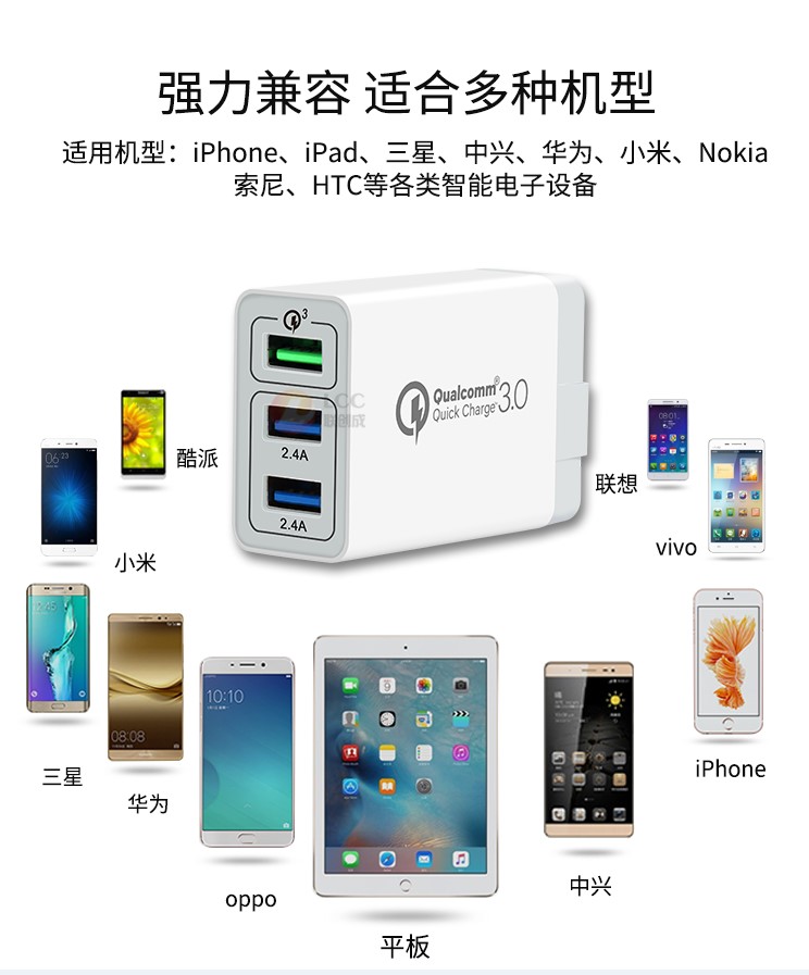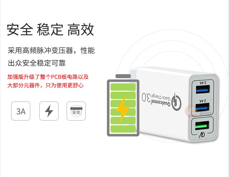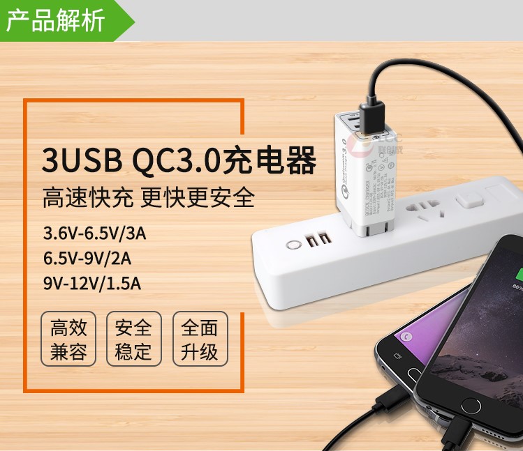 產(chǎn)品優(yōu)勢(shì):支持qc3.0快充技術(shù),qc3.0+2usb 2.4a穩(wěn)定輸出,不跳屏;