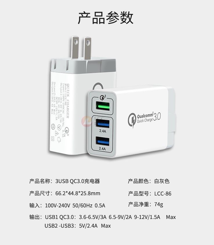 輸出功率:usb1 qc3.0:3.6-6.5v/3a 6.5-9v/2a 9-12v/1.5a;usb2-3:5v/2.4a