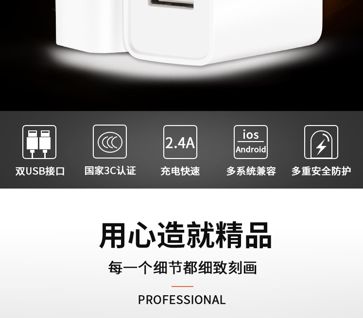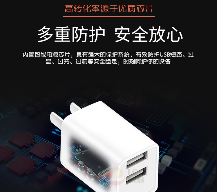 產(chǎn)品功能:支持2臺(tái)設(shè)備同時(shí)充電,智能ic自動(dòng)適配電流充電(根據(jù)手機(jī)所需電流決定);
