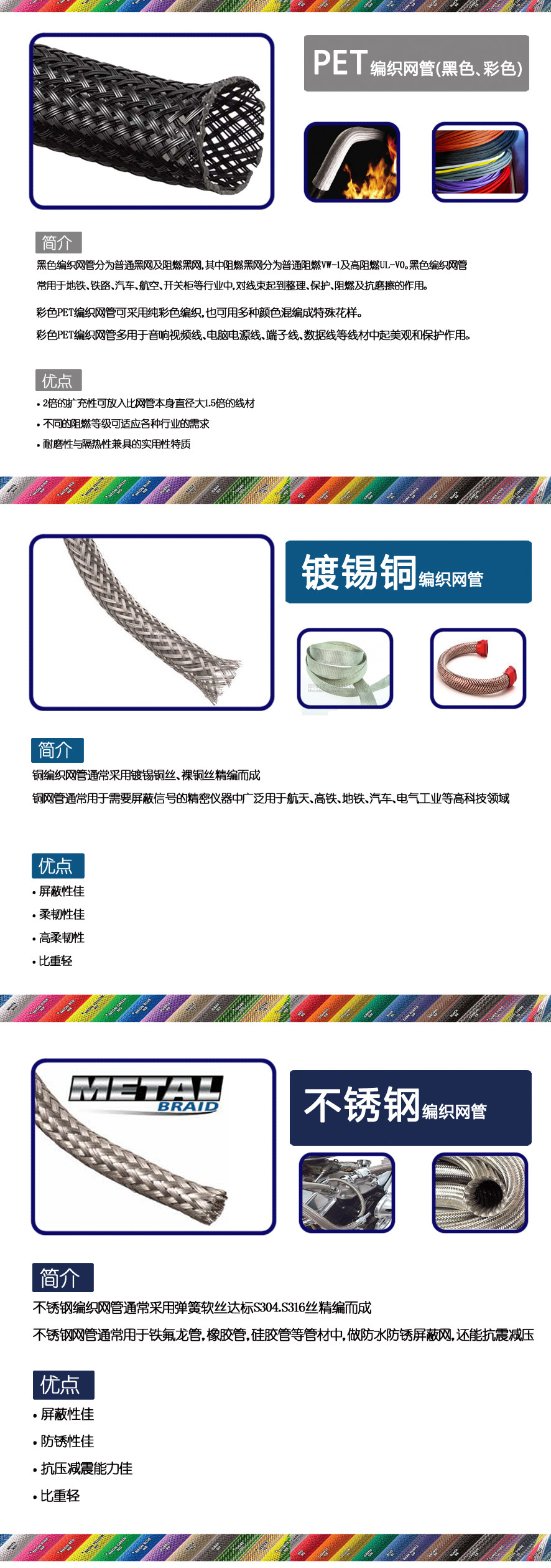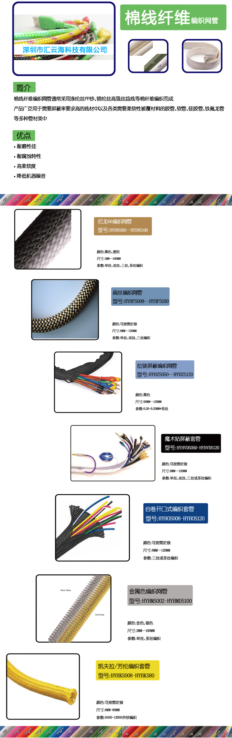 深圳市匯云科技有限公司是專(zhuān)業(yè)從事編織網(wǎng)管、銅編織管、圓形彩管、pp紗編織線、扁型網(wǎng)管(帶磨術(shù)貼)、擴(kuò)充網(wǎng)管、環(huán)保套管、pet網(wǎng)管等編織產(chǎn)品生產(chǎn)的內(nèi)資企業(yè)。公司擁有多條先進(jìn)的現(xiàn)代化生產(chǎn)檢測(cè)設(shè)備,使公司的產(chǎn)品在質(zhì)量上、數(shù)量上、服務(wù)上都得到了充分的保證,贏得了眾多賓客的認(rèn)可和信賴(lài)。 公司產(chǎn)品廣泛用于電腦電源、飛機(jī)汽車(chē)、光纖電纜、音響視頻等家用電器的線路上,保護(hù)路線不受磨損,延長(zhǎng)線路使用壽命起到了很好的保護(hù)作用。同時(shí)還可用在燈飾、圣誕禮品等產(chǎn)品的裝飾上,起到了很好的美觀效果。產(chǎn)品已通過(guò)ul認(rèn)證(認(rèn)證號(hào)為:e252099)和sgs認(rèn)證。