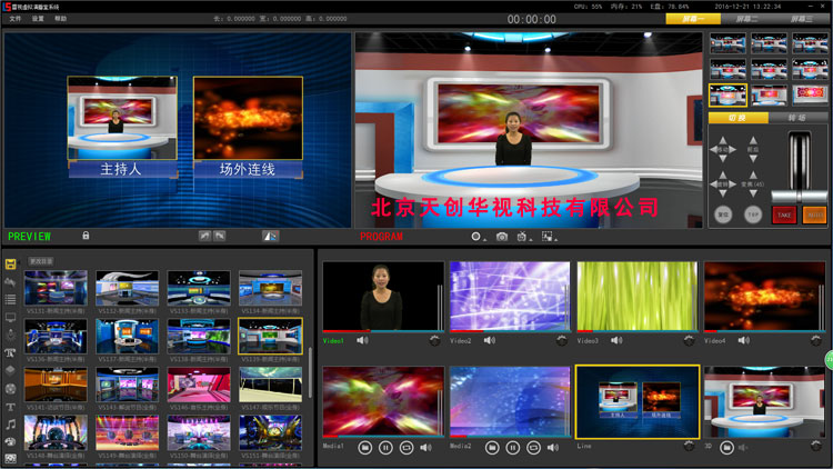 天創(chuàng)華視 tc vsm 4k真三維虛擬演播室系統(tǒng)設(shè)備界面簡潔符合傳統(tǒng)切換臺(tái)操作習(xí)慣,系統(tǒng)可升級(jí)成多格式高清切換臺(tái),易學(xué)易用