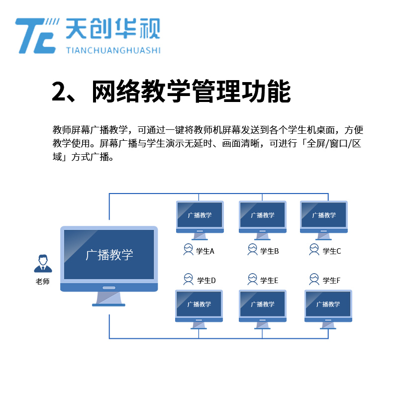 天創(chuàng)華視教學(xué)網(wǎng)絡(luò)方案是具有先技術(shù)而且更加適合學(xué)校教學(xué)環(huán)境的教學(xué)網(wǎng)解決方案,此系統(tǒng)采用萬(wàn)兆以太網(wǎng)和千兆網(wǎng)雙網(wǎng)結(jié)構(gòu),每臺(tái)工作站都可以單獨(dú)上下載視音頻素 材(根據(jù)權(quán)限控制)。