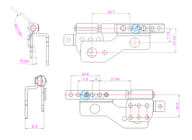 2.旋轉(zhuǎn)角度:旋轉(zhuǎn)-8~130度,-8度自鎖,出貨角度130度