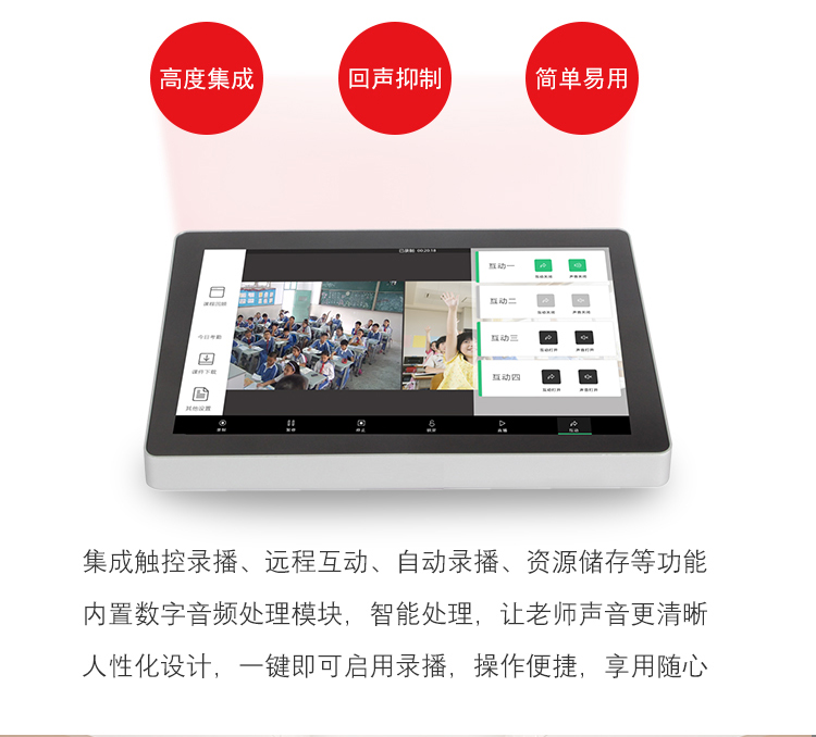 2.觸摸屏采用電容式觸控技術(shù)耐磨損、使用壽命長(zhǎng)。只需輕輕觸摸,即可響應(yīng),操作體驗(yàn)佳,觸摸定位精度1.5mm,響應(yīng)時(shí)間<10ms。錄播所有操作均可通過(guò)點(diǎn)觸實(shí)現(xiàn);