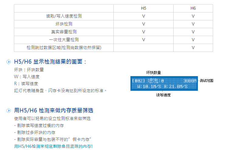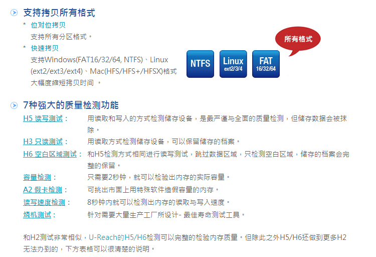 目前檢測(cè)閃存的質(zhì)量還是普遍使用h2軟件,但u-reach的h5/h6的閃存質(zhì)量檢測(cè),不僅可完整的檢驗(yàn)內(nèi)存質(zhì)量,還可做到更多h2無法辦到的,詳細(xì)比較請(qǐng)參照下表: