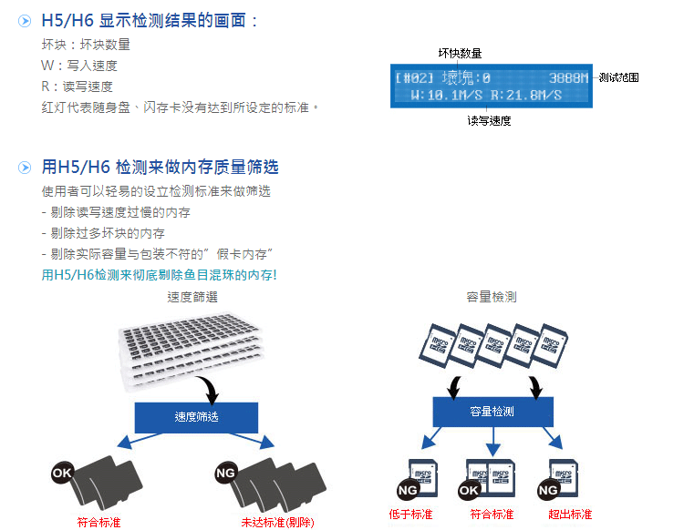 客戶換了一批新的的u盤后,在拷貝機(jī)上一樣使用讀寫檢測功能,讀寫檢測功能可確認(rèn)u盤是否有壞道(bad track),并同步檢測閃存的寫入速度(write speed)與讀取速度(read speed),先確認(rèn)u盤健康度,還好這批u盤寫入速度可達(dá)8兆/秒并且沒有壞塊,這次12g的數(shù)據(jù),拷貝+比對我們僅僅只用了30+分鐘,兩批 u盤相比較,健康的u盤效率提高了約4倍,成功率還是百分之百的通過。