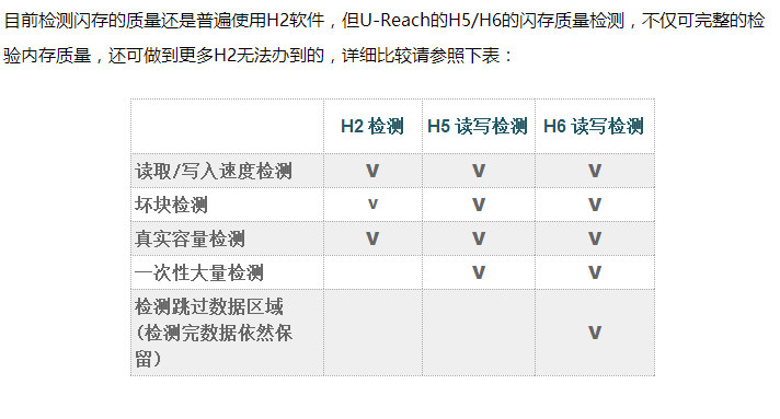 目前檢測閃存的質量還是普遍使用h2軟件,但u-reach的h5/h6的閃存質量檢測,不僅可完整的檢驗內存質量。除此之外,h5/h6質量檢測還可做到更多h2無法辦到的,詳細比較請參照下表