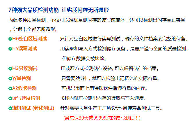 h5讀寫檢測 用讀取和寫入的方式檢測儲存設備,是最嚴謹與全面的質量檢測,儲存數(shù)據會被抹除。