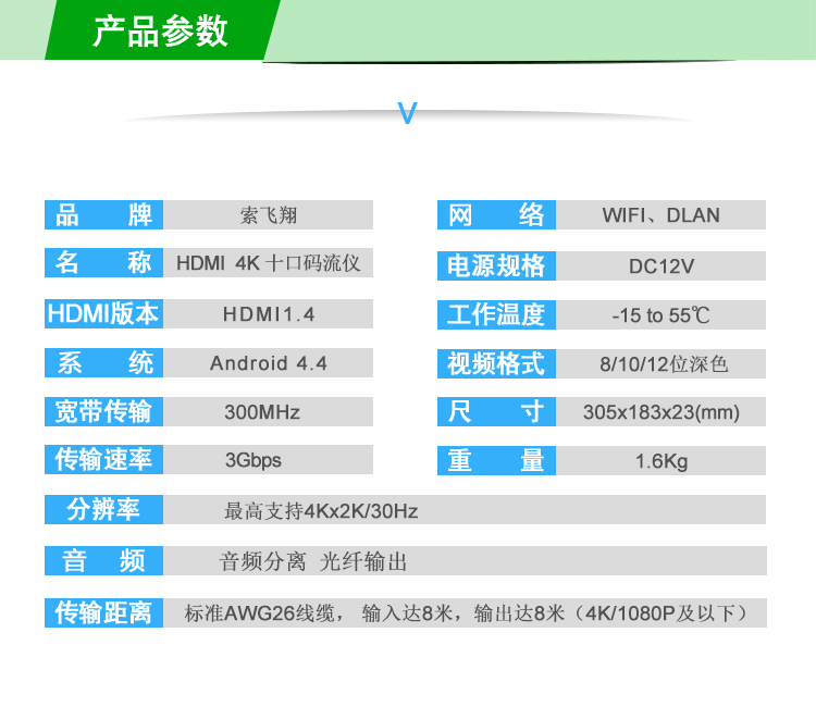 索飛翔品牌主要產(chǎn)品有:高清碼流儀,一進(jìn)四出碼流儀/播放機(jī),一進(jìn)八出碼流儀/播放機(jī),一進(jìn)十出碼流儀/播放機(jī),一分二分配器,一分四分配器,一分八分配器,一分十六分配器,;二進(jìn)出,二進(jìn)四出,二進(jìn)八出,二進(jìn)十二出;hdmi切換器三分一、四分一、五分一、hdmi轉(zhuǎn)換器vga、vga轉(zhuǎn)hdmi,hdmi轉(zhuǎn)av,av轉(zhuǎn)hdmi,sdi轉(zhuǎn)hdmi,hdmi轉(zhuǎn)sdi,數(shù)字信號(hào)轉(zhuǎn)模似信號(hào),模似信號(hào)轉(zhuǎn)數(shù)字信號(hào);hdbaset延長器100m,70m;hdmi矩陣4進(jìn)4出、4進(jìn)2出、8進(jìn)8出;hdmi傳輸器30m,50m,60m,70m,100m,120m等系列產(chǎn)品。廣泛用于家庭影院,電視賣場,高級(jí)會(huì)議,醫(yī) 療器械,跟監(jiān)控視頻,歡迎廣大中間商、貿(mào)易商前來加盟合作。