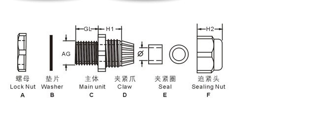 夾緊爪與密封件特殊之設(shè)計,配合迫緊頭裝配省時便利,夾緊電纜范圍大,抗拉力特強(qiáng),可防水、防塵、防鹽 、耐酸 堿 、 酒精、油、脂及一般溶劑