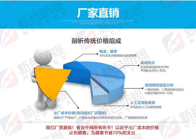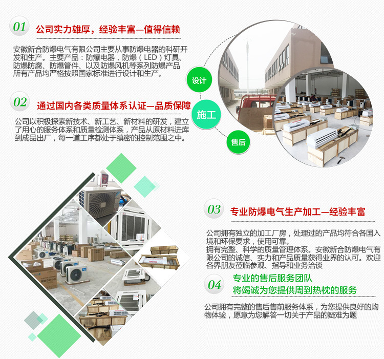 安 徽新合防爆電氣有限公司主要從事防爆電器的科研開(kāi)發(fā)_和生產(chǎn)。主要產(chǎn)品:防爆電器,防爆(led)燈具、防爆防腐、防爆管件、以及防爆風(fēng)機(jī)等系列防爆產(chǎn)品 。對(duì)發(fā)_展,公司秉承“敢于創(chuàng)新、誠(chéng)信務(wù)實(shí)、質(zhì)量第一”的理念,所有產(chǎn)品均嚴(yán)格按照國(guó)家標(biāo)準(zhǔn)進(jìn)行設(shè)計(jì)和生產(chǎn),并以設(shè)計(jì)造型美觀、檢修方便、配套功能齊全、廣泛應(yīng)用于石油、化工、鋼鐵、冶金、礦山、消防及燃?xì)、鐵路、電力、部隊(duì)等各個(gè)領(lǐng)域。 對(duì)員工,公司恪守“人性至上、成就有意愿的人、讓大家有尊嚴(yán)的生活為根本,充分引爆人人潛力,讓每個(gè)人自信工作的同時(shí),快樂(lè)的獲得財(cái)富,獲得成長(zhǎng)”。 對(duì)客戶,公司承諾“讓客戶買的有尊嚴(yán)的三不承諾:1、不亂報(bào)價(jià)格,誤導(dǎo)客戶!2、不拖延貨期,耽誤客戶使用!3、售后服務(wù)問(wèn)題不逃避,1個(gè)小時(shí)內(nèi)給出讓客戶滿意的答案! 公司以積極探索新技術(shù)、新工藝、新材料的研發(fā)_,建立了用心的服務(wù)體系和質(zhì)量檢測(cè)體系,產(chǎn)品從原材料進(jìn)庫(kù)到成品出廠,每一道工序都處于縝密的控制范圍之中。公司始終密切關(guān)注和跟蹤防爆行業(yè)的發(fā)_展動(dòng)態(tài),不斷地進(jìn)行技術(shù)升級(jí)改造,保持產(chǎn)品工藝技術(shù)與加工檢測(cè)設(shè)備的先進(jìn)性。 新合防爆實(shí)施雙贏合作戰(zhàn)略,在競(jìng)爭(zhēng)激烈的市場(chǎng)經(jīng)濟(jì)環(huán)境下,與廣大經(jīng)銷商和供應(yīng)商通力合作,廣泛建立戰(zhàn)略合作聯(lián)盟,實(shí)現(xiàn)優(yōu)勢(shì)互補(bǔ),雙贏誠(chéng)信經(jīng)營(yíng)的共同發(fā)_展。 新合防爆著力于以人為本,以客戶為中心的管理團(tuán)隊(duì)、專業(yè)化員工團(tuán)隊(duì)、專業(yè)服務(wù)中心及專業(yè)服務(wù)部。營(yíng)銷和服務(wù)網(wǎng)絡(luò)已覆蓋全國(guó)市場(chǎng),能夠?qū)蛻舻男枨、期望和滿意持續(xù)的保持,并承諾在1小時(shí)內(nèi)為客戶提供高績(jī)效、專業(yè)化和敏捷性的售前、售中及售后服務(wù)!