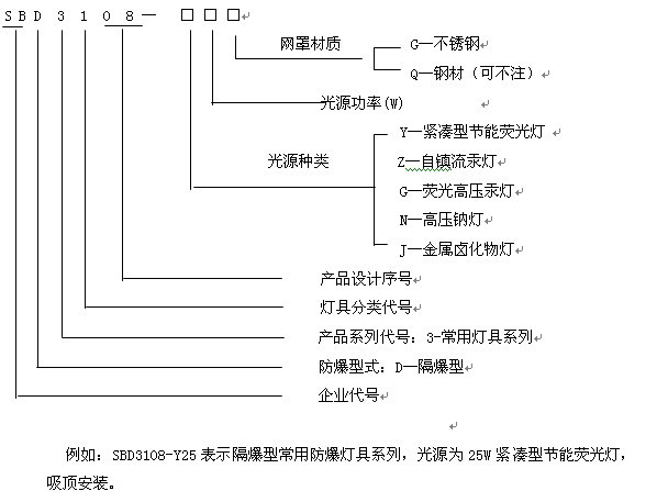 1. 防爆型式隔爆型,適用于爆炸危險場所照明使用。