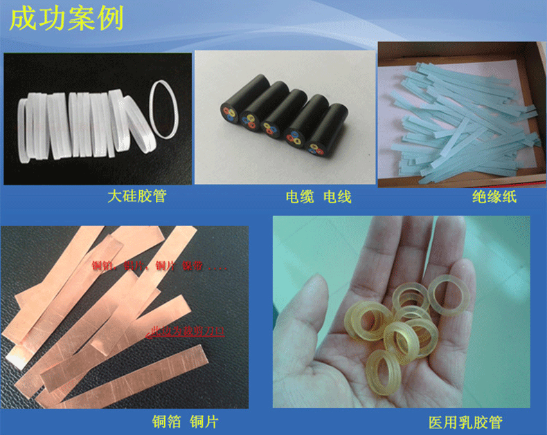 本機適用于電子絕緣套管 pvc管 塑橡膠軟管 熱縮套管 玻璃纖維管 硅膠管 伸縮管 黃蠟管pe管 纖維管 鐵氟龍?zhí)坠?熱縮電池套, pvc塑料管帶,玻璃纖維管,塑料膠軟管,絕緣紙,鎳片,魔術(shù)貼(粘扣帶),粘貼帶、銅箔鋁箔,焊帶,光纖帶,金屬薄片,金屬扎(帶)線,pvc塑料帶,玻璃纖維管,電線排線等塑料軟管狀材料的定長切割均可。