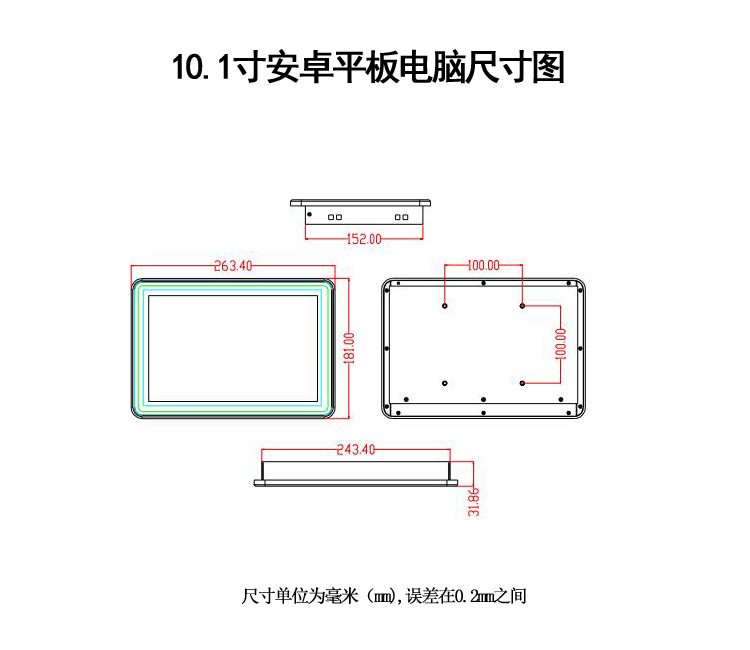 規(guī)格: 顯示屏10.1″ tft led 分辨率 1280*800顯示特征亮度350 cd/m2 對(duì)比度800:1 透光率80%以上 觸摸屏電容式觸摸屏 尺寸263*181*31(長(zhǎng)*寬*高) cpu 瑞芯微rk3288 1.8ghz 四核處理器 運(yùn)行內(nèi)存標(biāo)配2gb(可選4g) 無(wú)線wifi /藍(lán)牙/ 4g網(wǎng)絡(luò)(可選)gps(可選) 性能配置來(lái)電開機(jī)可實(shí)現(xiàn) 內(nèi)置存儲(chǔ)器emmc 8g(可選) 電源電源特性dc12v 操作系統(tǒng)操作系統(tǒng)android 5.1 usb2*usb2.0 接口 網(wǎng)口1*rj45 千兆網(wǎng)絡(luò)接口 串口1*rs2329(可選1*ttl)i/o 接口gpio(可選)1*gpio(4進(jìn)4出) 卡槽1*tf卡槽,1*sim卡槽 音頻1*line out 顯示 1*hdmi 抗振動(dòng)5-19hz/1.0mm 振幅;19-200hz/1.0g 加速度 抗沖擊10g 加速度,11ms 周期 ip 防護(hù)等級(jí)前面板 ip68 環(huán)境測(cè)試可靠性mtbf≥50000h; mttr≤0.5h 工作溫度-20℃~70℃ 表面空氣流動(dòng) 存儲(chǔ)溫度-30℃~80℃ 工作濕度95% @40℃, 無(wú)凝露 尺寸263.4毫米 (長(zhǎng)) *181毫米(寬) *31.8毫米 (高)物理特征材料鋁合金面板設(shè)計(jì) 重量1.4kg(凈重) 顏色黑色