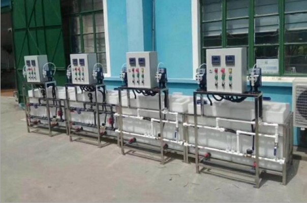 加藥裝置根據(jù)所需藥劑 濃度,在攪拌箱內(nèi)配制,經(jīng)攪拌器攪拌均勻后投入溶液箱、用計(jì)量泵(加藥泵)向投藥點(diǎn)或指定的系統(tǒng)中輸送所配制的溶液。
