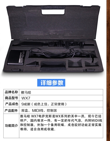 日本yamaha音樂(lè)株式會(huì)社,電吹管珍品wx-7搭配音源wt-11,帶兩個(gè)吹嘴。經(jīng)過(guò)測(cè)試,一切功能正常。該管的設(shè)置了薩克斯管的常用調(diào)的轉(zhuǎn)換,降b和降e調(diào),七個(gè)八度,可直接用于高音中音及次中 音薩克斯的演奏,按鍵指法與薩克斯極為相似,也可以說(shuō)是一模一樣。還有氣息強(qiáng)弱調(diào)制、發(fā)音敏感度調(diào)制等功能。