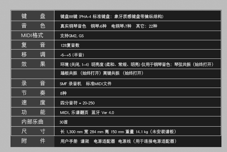 電源線(配套電源適配器)選購(gòu)(另售)耳機(jī)電流消耗直流電 15伏/ 2500毫安 尺寸(不包含譜架)寬1380 毫米 深 485 毫米 高 850 毫米 尺寸(包含琴架及譜架) 寬 1380 毫米 深 485 毫米 高 1000 毫米 重量(包含譜架) 重量 48公斤