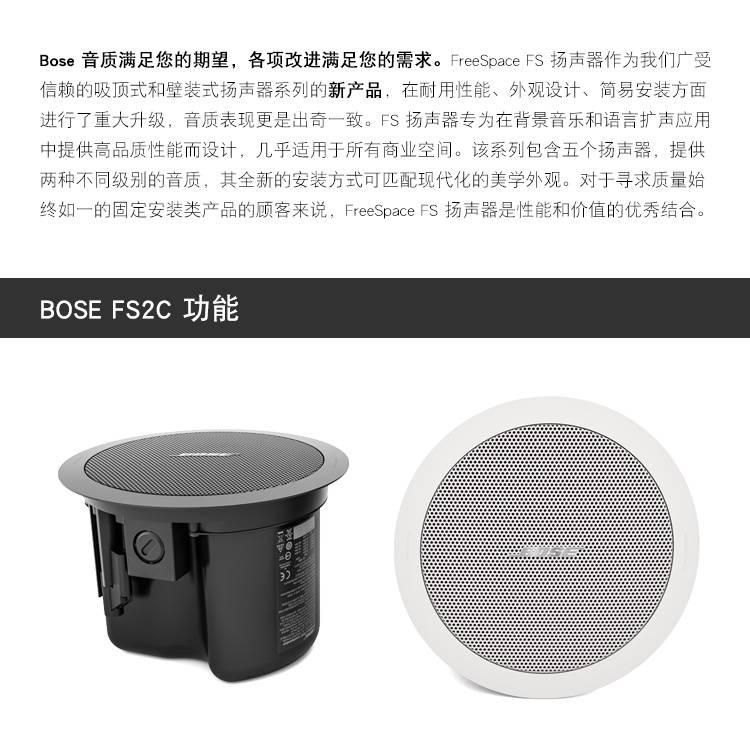 freespace fs 揚聲器作為我們廣受信賴的吸頂式和壁裝式揚聲器系列 的新產(chǎn)品,在耐用性能、外觀設(shè)計、簡易安 裝方面進(jìn)行了重大 升級,音質(zhì)表現(xiàn)更是出奇一致。fs 揚聲器專為在背景音樂和語言擴聲應(yīng) 用中提供高品質(zhì)性能而設(shè)計,幾乎適用于所有商業(yè)空間。該系列包含五 個揚聲器,提供兩種不同級別的音質(zhì),其全新的安 裝方式可匹配 現(xiàn)代化的美學(xué)外觀。對于尋求質(zhì)量始終如一的固定安 裝類產(chǎn)品的顧客 來說,freespace fs 揚聲器是性能和價值的結(jié)合。 fs2c 為吸頂型號,配有全頻 2.25 英寸揚聲器單元,低頻下限可達(dá) 83 hz,靈敏度為 86db spl / 1 w @ 1 m。