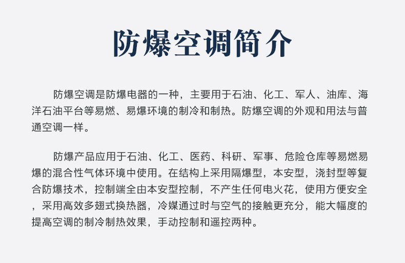 宏中格防爆空調(diào)系列機(jī)型通過特殊防爆技術(shù)加工處理,廣泛應(yīng)用于國防、科研、石油、化工、醫(yī) 藥、加工制造、生物等存在ⅱa、ⅱb級(jí),t1~t4組可燃性氣體、蒸汽與空氣混合形成的易引發(fā)的危險(xiǎn)場(chǎng)所,是針對(duì)有溫度控制要求場(chǎng)所設(shè)計(jì)的特種調(diào)溫空調(diào)設(shè)備。