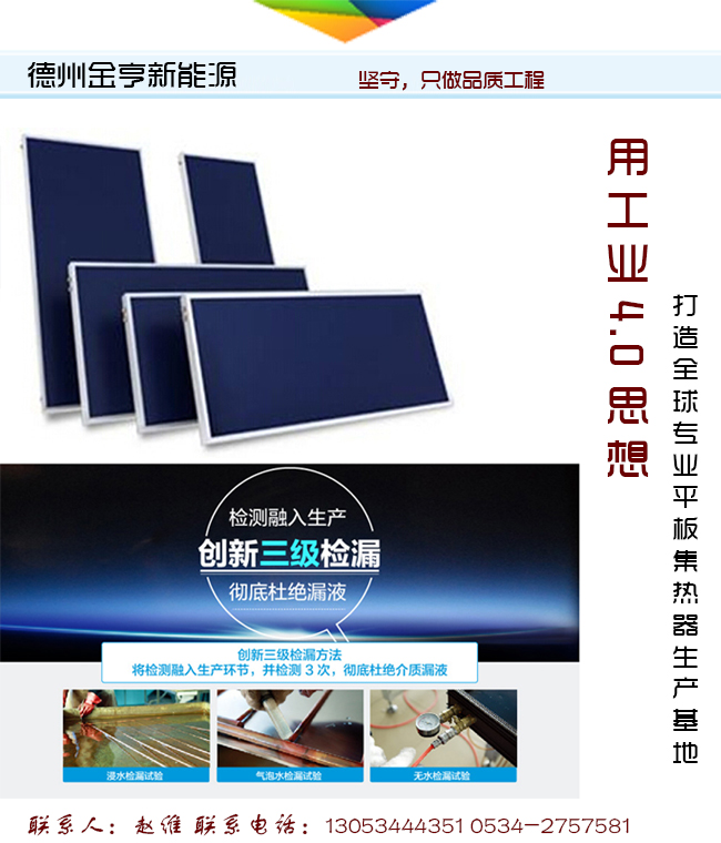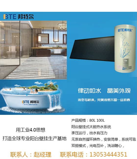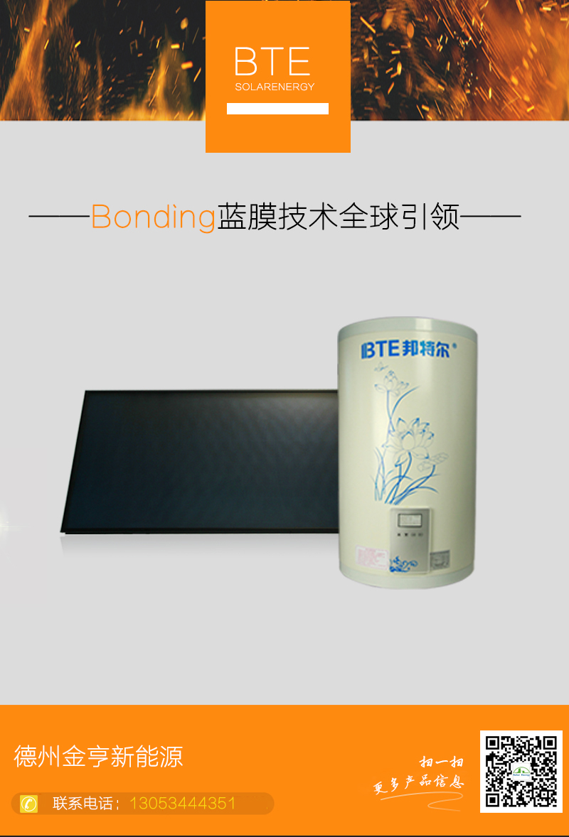 德州金亨新能源有限公司,專注于太陽能光熱的應(yīng)用領(lǐng)域,主要產(chǎn)品:平板集.器(高效/高寒/高溫)、太陽能熱水器、u型管集熱器(高效/長壽型)熱管集熱器、無水箱熱水器、線性聚焦集熱器、蒸汽集熱器、熱儲存器等。太陽能熱水器產(chǎn)品介紹:陽臺壁掛式太陽能熱水器是專門為高層、小高層住宅配套設(shè)計開發(fā),彌補了傳統(tǒng)的太陽能熱水器由于先天不足無法實現(xiàn)與建筑及環(huán)境完美結(jié)合的遺憾,這一開發(fā)真正體現(xiàn)了太陽能與建筑及環(huán)境體化的完美結(jié)合。陽臺壁掛太陽能屬于分離式太陽能熱水系統(tǒng),水箱放置在陽臺內(nèi),集熱器放置在建筑南里面陽臺上。它的熱性能高、安 全性好、使用壽命長、容量大的同時,降低生產(chǎn)成本,安 裝靈活快捷