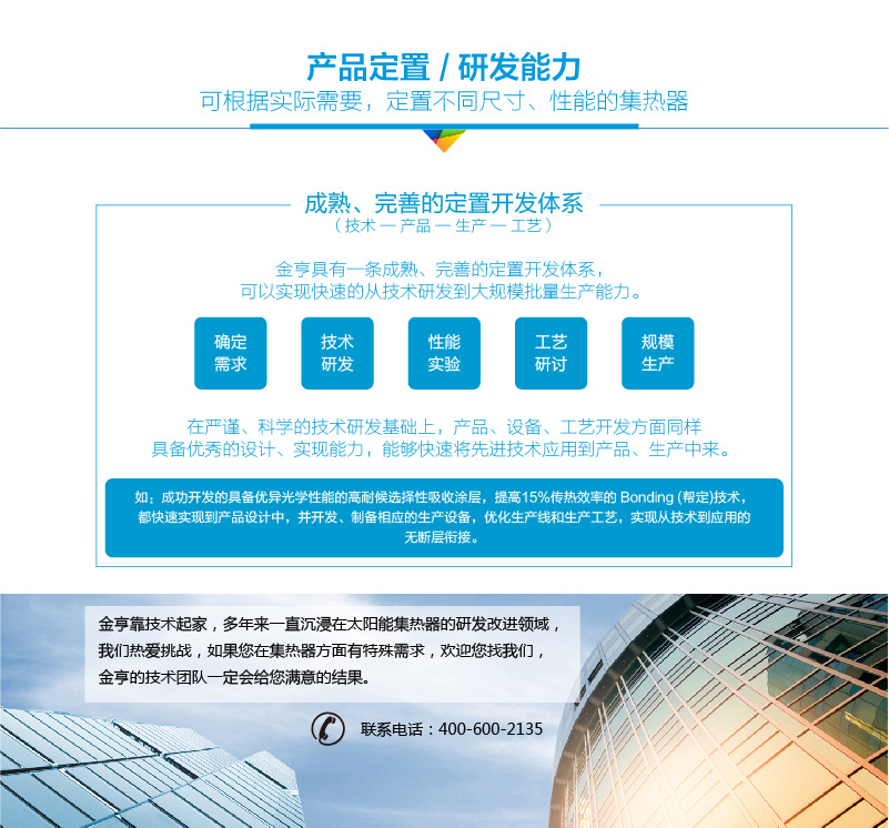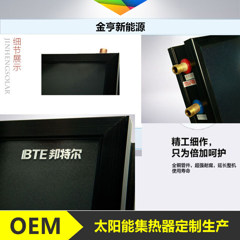 伴跟著陽臺壁掛太陽能技能及體系技能的漸漸老練以及對本身優(yōu)勢的充沛認(rèn)知,平板太陽能集熱體系現(xiàn)已漸漸在與修建聯(lián)系,暫有的聯(lián)系方法主要有幾種:陽臺壁掛式、別墅半嵌入式、幕墻式等等,雖然現(xiàn)在一切的這些僅僅與修建聯(lián)系的雛形,可是預(yù)示著平板集熱體系現(xiàn)已開端融入修建,漸漸的,陽臺壁掛太陽能將作為修建的一有些呈現(xiàn)。 德州金亨新能源有限公司,成立于2009年,坐落于中國太陽城德州,是一家專業(yè)致力于高性能太陽能集熱器的研發(fā)、生產(chǎn)、應(yīng)用的技術(shù)創(chuàng)新型企業(yè),擁有多項自主知識產(chǎn)權(quán)的核心技術(shù),包括平板型太陽能集熱器高耐候選擇性吸收涂層(藍(lán)膜)磁控濺射制備技術(shù)、幫定 (bonding)傳熱技術(shù)、高溫選擇性吸收涂層制備技術(shù)和相變材料蓄熱(pcm)技術(shù)等。創(chuàng)業(yè)之初憑借技術(shù)建廠,利用“破銅爛鐵”造機器,生產(chǎn)的產(chǎn)品震驚國家檢測機構(gòu)工程師,經(jīng)過多年改革創(chuàng)新,自主研制的生產(chǎn)線實現(xiàn)高度自動化,生產(chǎn)效率達(dá)到國際領(lǐng)先水平——55秒/臺。金亨致力于“用工業(yè)4.0的思想,打造全球?qū)I(yè)的平板集熱器生產(chǎn)基地”,目前為全國上百家企業(yè)供應(yīng)平板集熱器,并廣受好評。