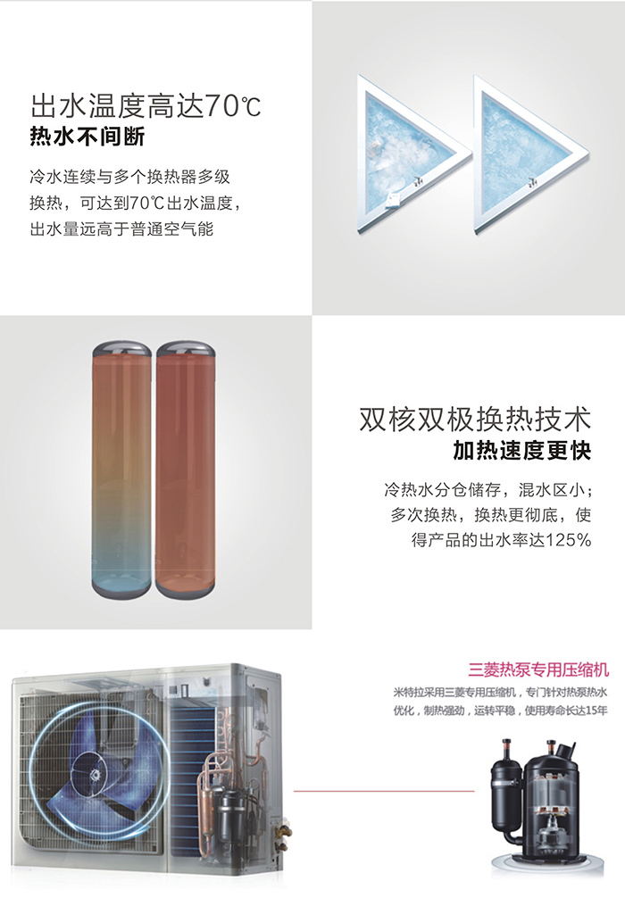 出水溫度高達70℃,出水量遠高于普通空氣能;