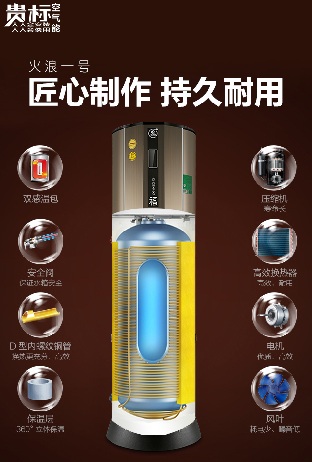 貴標空氣能,給你一個溫暖的家。貴標空氣能高效節(jié)能:制造相同的熱水量,是一般電熱水器的4-6倍,其年平均熱效比是電加熱的4倍。貴標空氣能熱水器是通過介質換熱,不用電加熱元件與水直接接觸,防止漏電的危險,以及燃氣熱水器可能爆炸和中毒的危險。