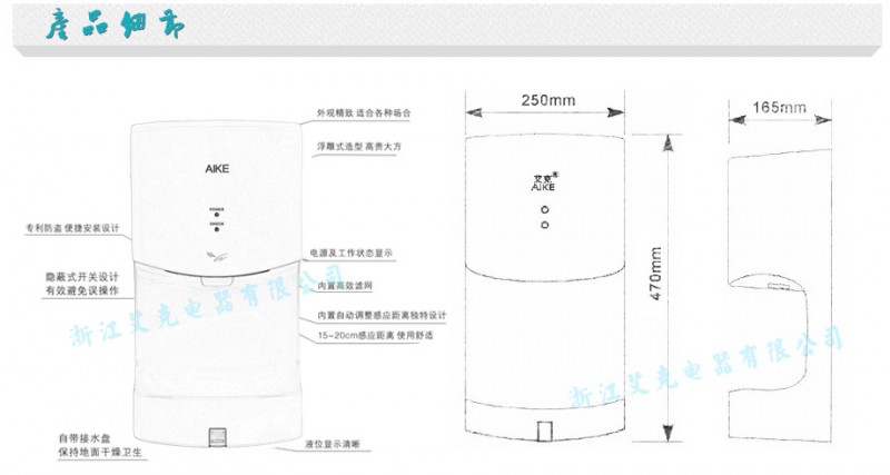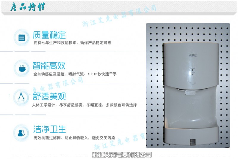 艾克公司從成立之初即專注于高端干手器和健康電器的研發(fā)和制造,致力于為追求高品質(zhì)生活的人們提供具有設計領先、人性化衛(wèi)生間科技、可靠品質(zhì)的衛(wèi)生間健康電器產(chǎn)品。艾克已經(jīng)成為高端干手器領導者在競爭激烈的公共衛(wèi)浴行業(yè),立足腳步,不斷拓取“引領中國的干手器”走向全球。